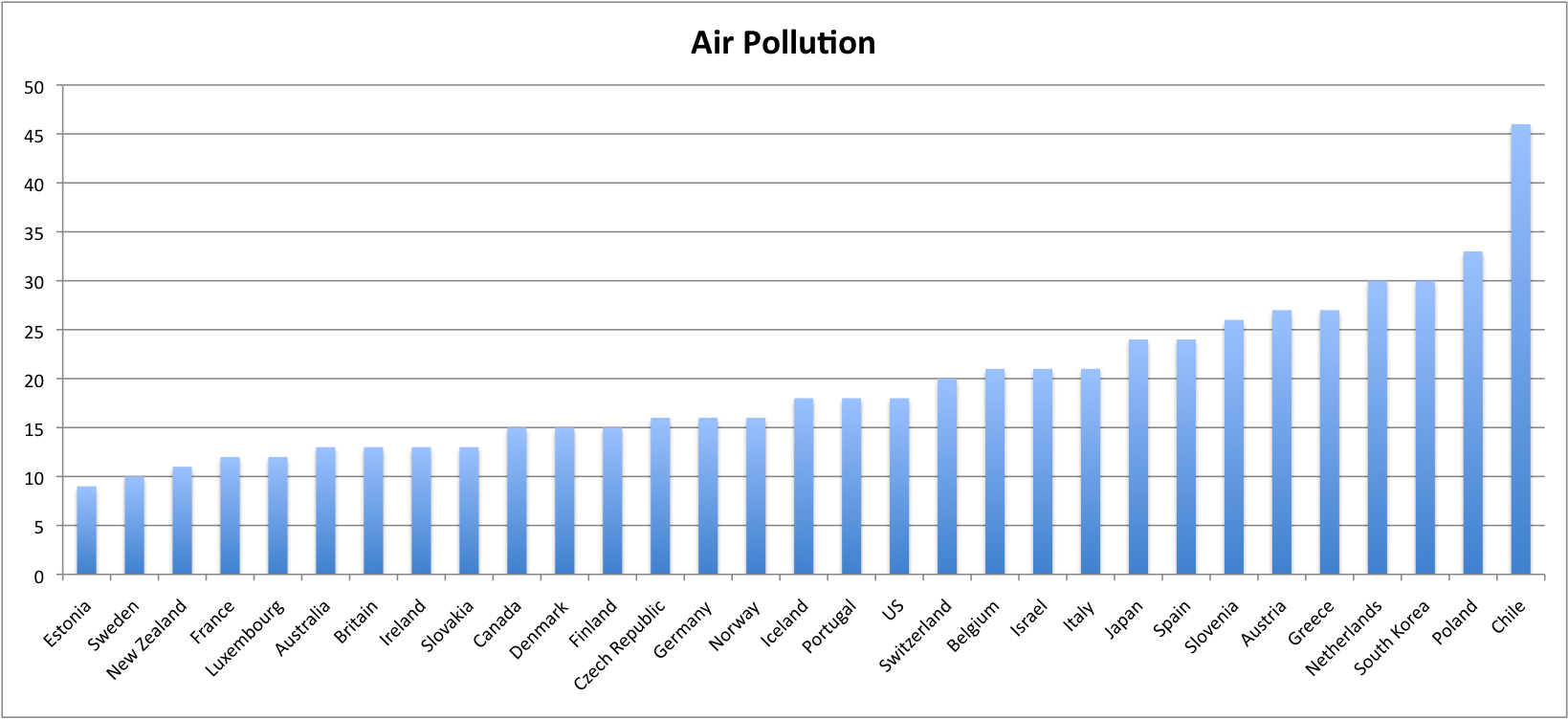 - Air Pollution (The indicator is urban-population weighted average of annual concentrations of particulate matters less than 10 microns in diameter (PM10) in the air in residential areas of cities with more than 100,000 residents.)