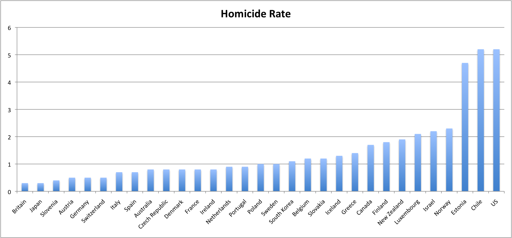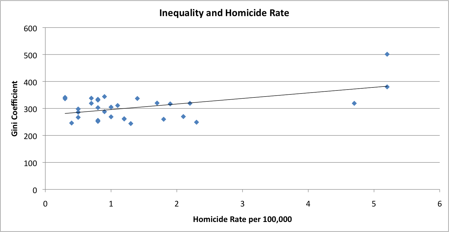 The more unequal a society it, the greater a chance you will be murdered. There is almost zero correlation between GDP per capita and homicide rates (-.01).