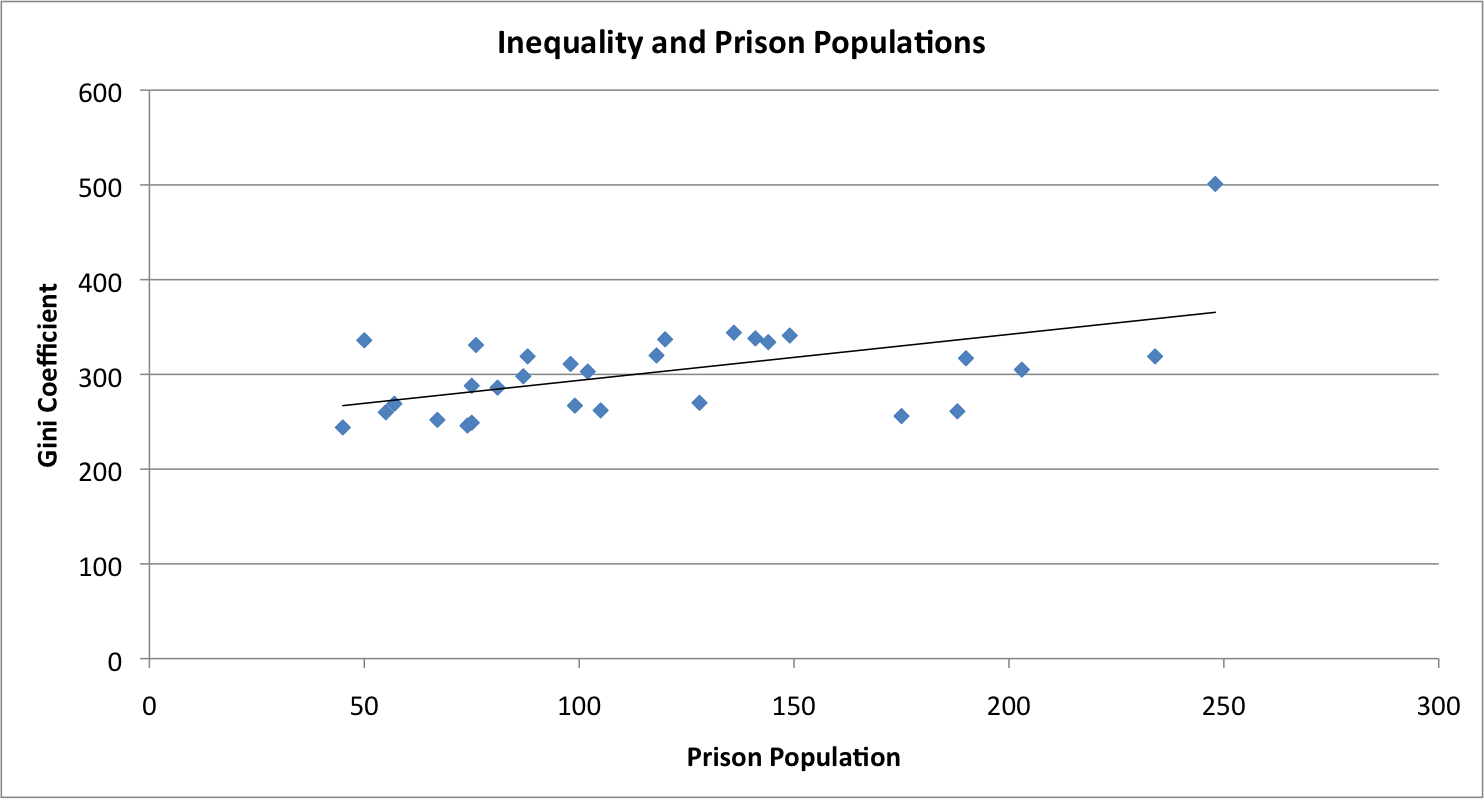 Not only does inequality increase prison populations, it also directly correlates with homicide rates (+.53).