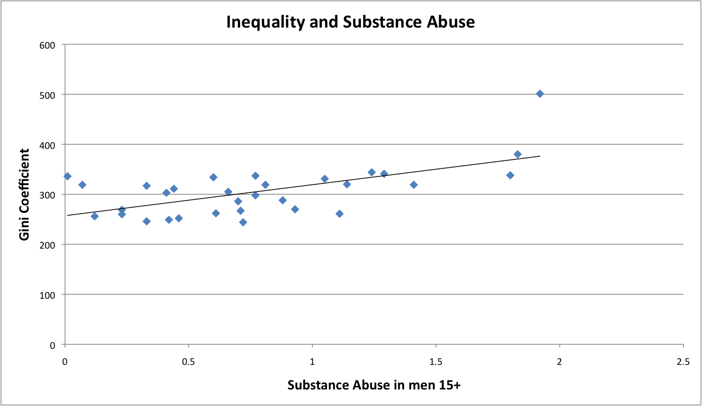 In addition to higher infant mortality rates, larger prison populations, and increased homicide rates, there is a greater prevalence of substance abuse in more unequal societies (.62).
