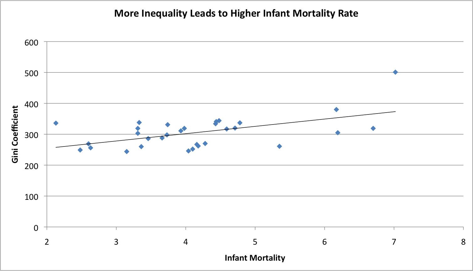 In order to show that inequality has a worse effect on individuals’ wellbeing, I need to go through quite a bit of data. I need to show how measures of wellbeing such as infant mortality correlate with inequality, on the one hand, versus wealth on the other. Bear with me as we sift through the numbers.