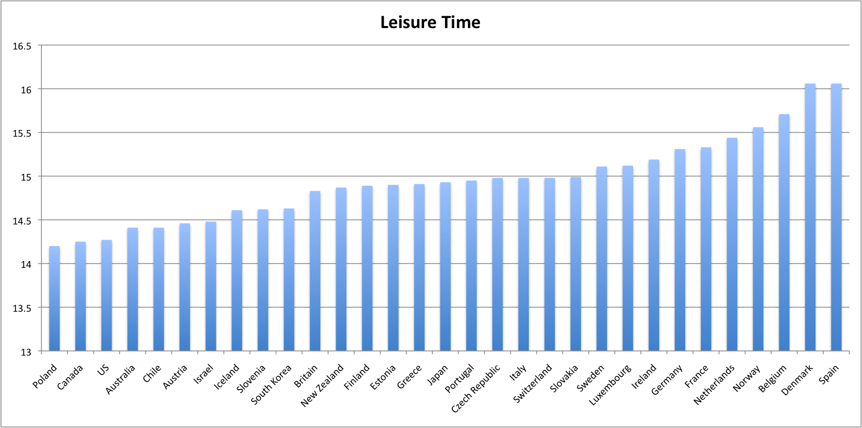 - Leisure Time (This indicator measures the amount of minutes (or hours) per day that, on average, full-time employed people spend on leisure and on personal care activities.)