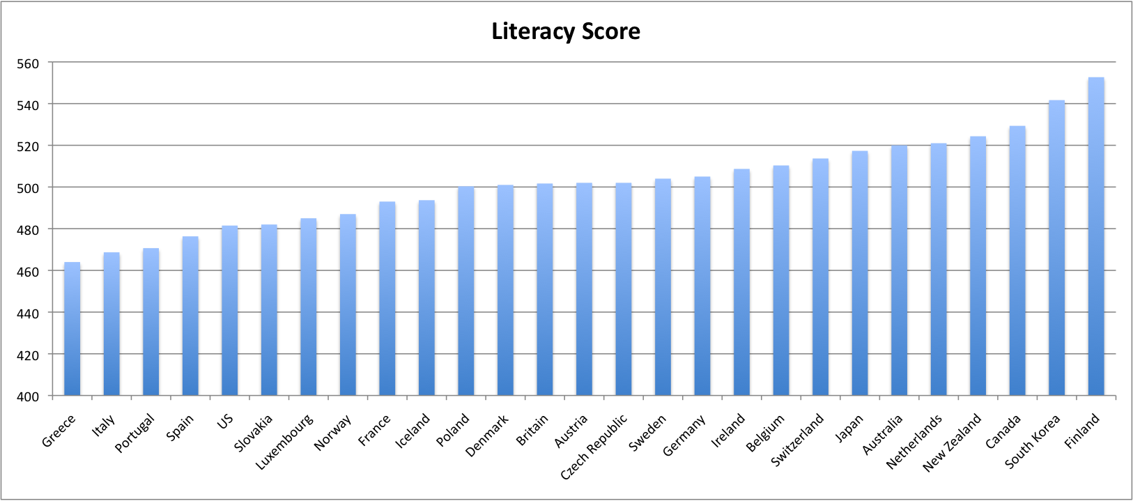 - Countries that seem less corrupt have higher literacy scores (+.52).