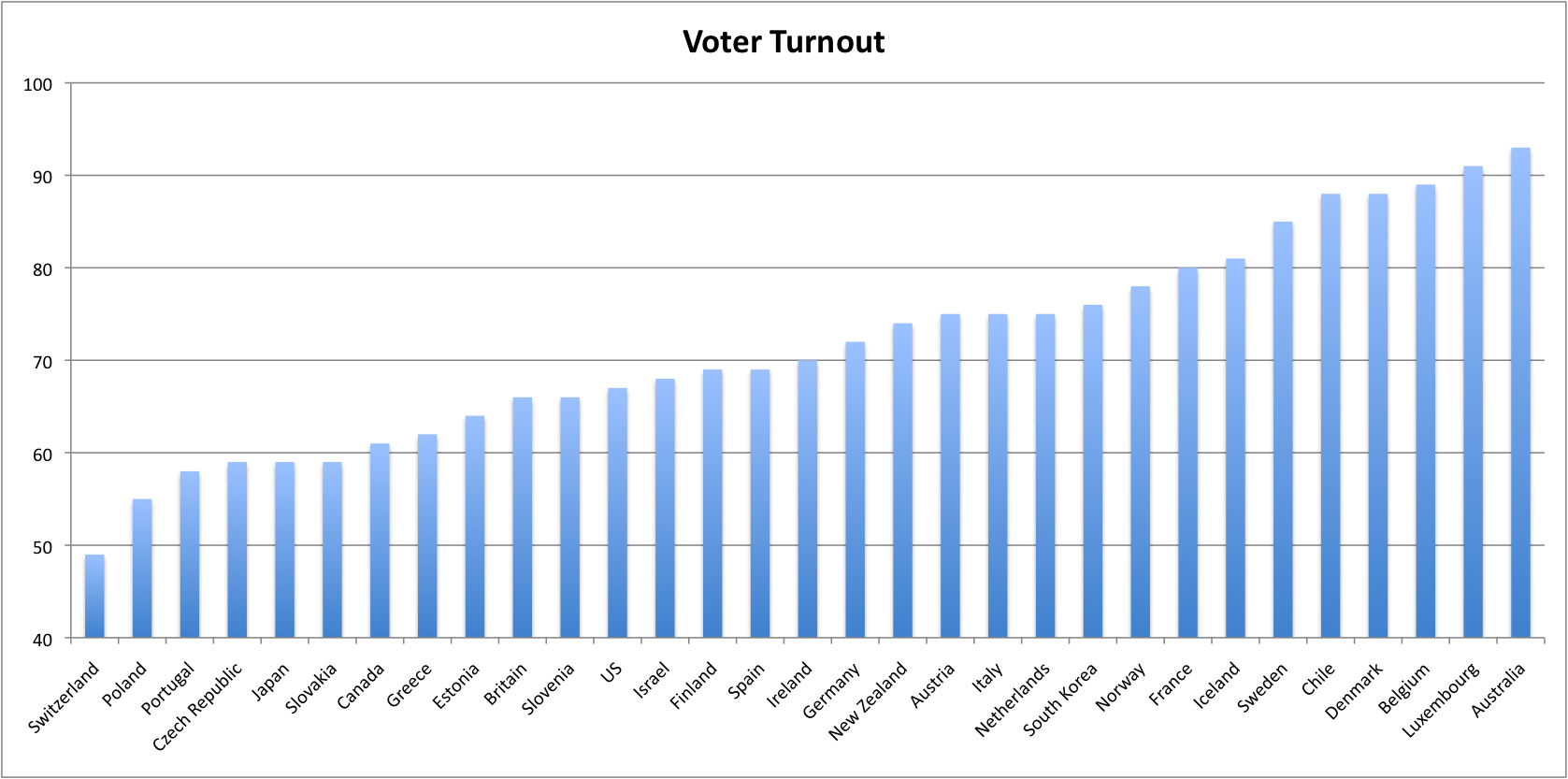 - Voter Turnout (Voter turnout is here defined as the ratio between the number of individuals that cast a ballot during an election (whether this vote is valid or not) to the population registered to vote.) Note here that Australia has the highest voter turnout, which is to be expected since it’s mandatory to vote there.